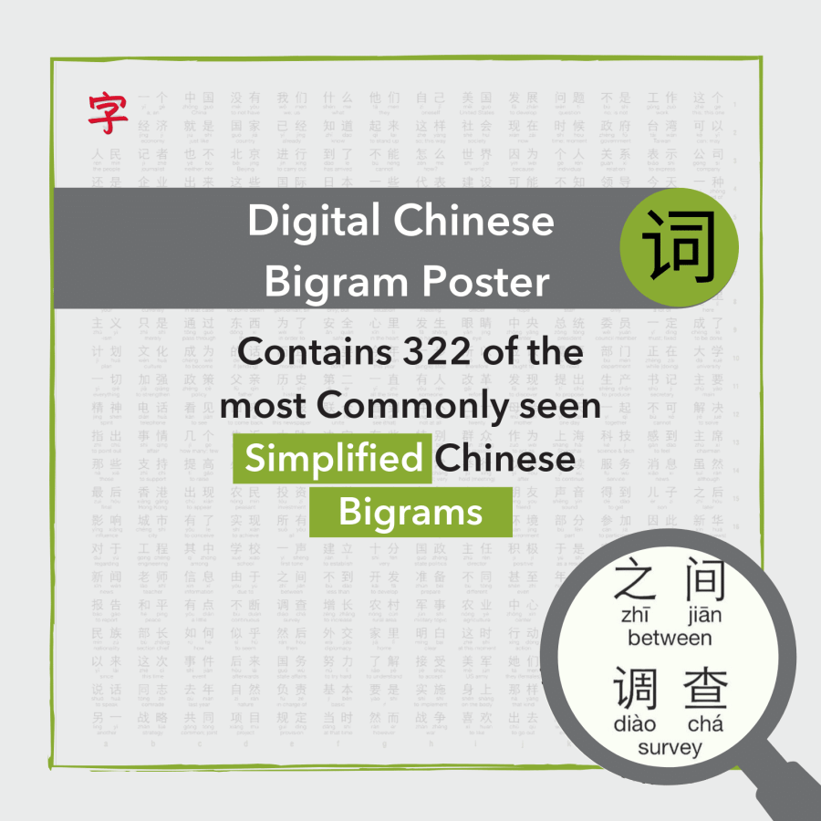 Our new Bigrams poster can help you learn 322 of the most commonly written Bigrams, and also help Chinese learners to recognize patterns between characters and meaning.